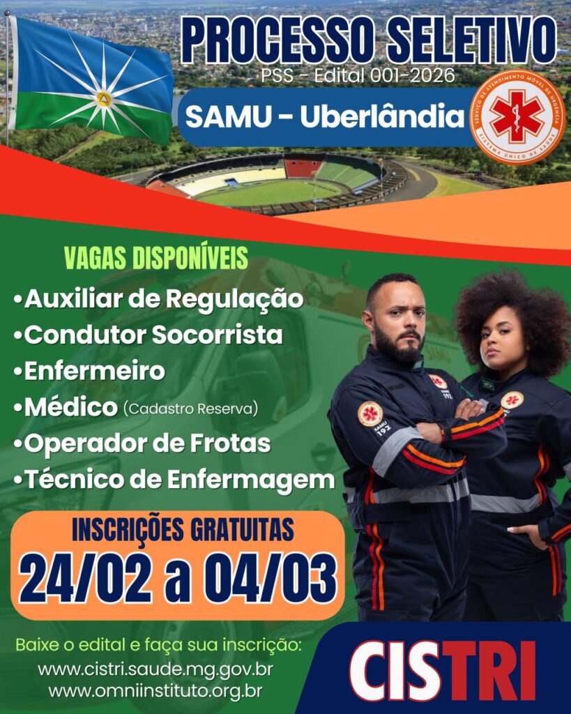 O Serviço de Atendimento Móvel de Urgência (SAMU 192), no município de Uberlândia, informa que estão abertas as inscrições para o Processo Seletivo Simplificado, destinado ao provimento de vagas e à formação de cadastro de reserva, conforme as necessidades do serviço.