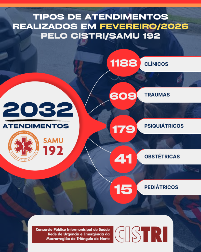 Em fevereiro/2026, o CISTRI/SAMU 192 realizou 2.032 atendimentos, reforçando nosso compromisso com a saúde e a segurança da população da macrorregião do Triângulo do Norte. 💙
